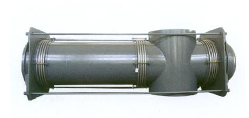 性能特點(diǎn):該膨脹節(jié)的前部(輸流端)有兩個(gè)工作波紋管,后部(盲端)有一個(gè)平衡波紋管構(gòu)成。工作波紋管吸收來(lái)自彎管段產(chǎn)生的橫向位移;平衡波紋管吸收來(lái)自直管段的軸向位移。