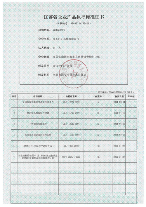 江蘇省企業(yè)產(chǎn)品執(zhí)行標(biāo)準(zhǔn)證書